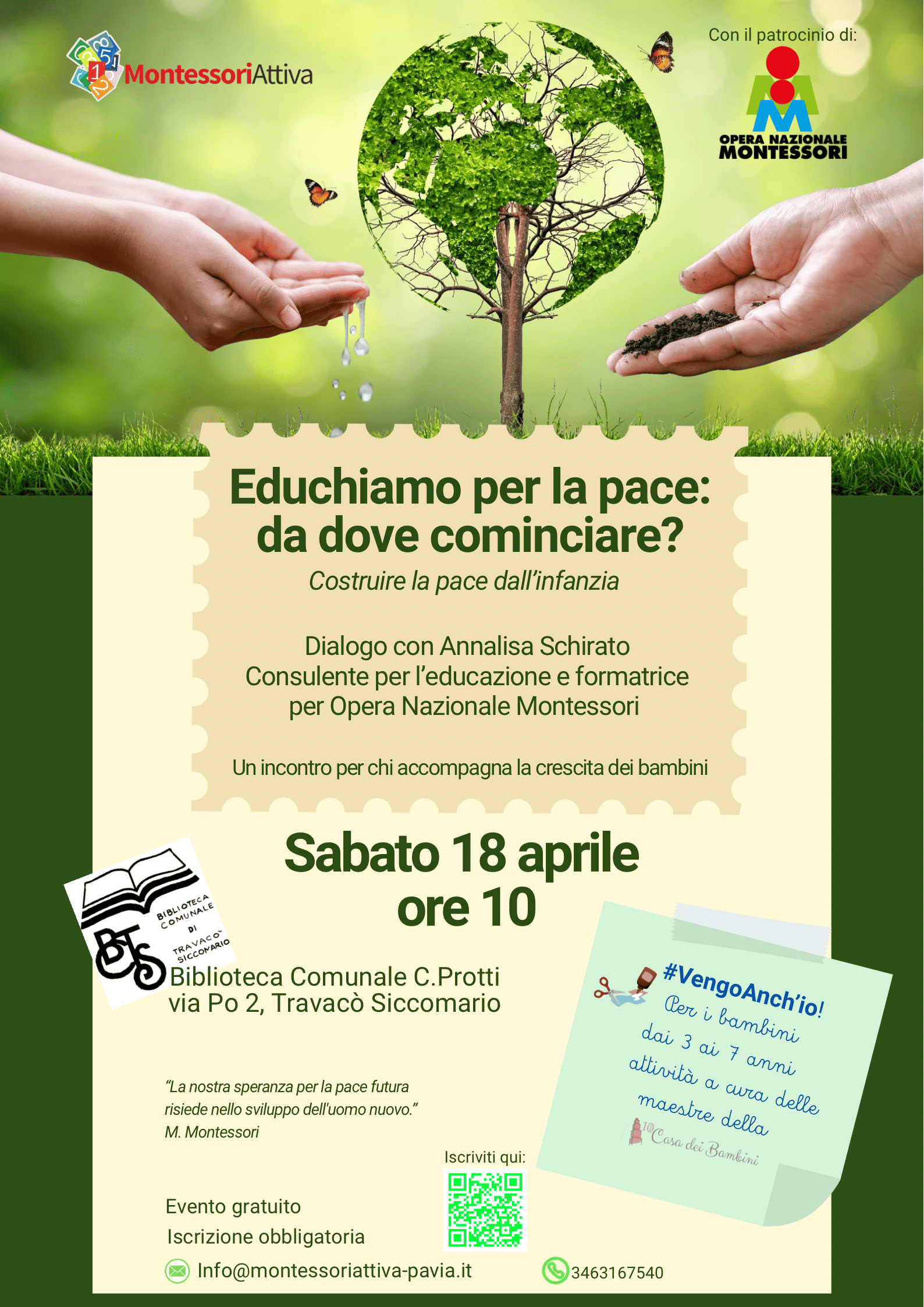 L’Associazione MontessoriAttiva di Pavia organizza per sabato 18 aprile l’incontro dal titolo “Educhiamo per la pace: da dove cominciare? Costruire la pace dall’infanzia” previsto per le ore 10,00 presso la Biblioteca Comunale “C. Protti” in via Po, 2 a Travacò …