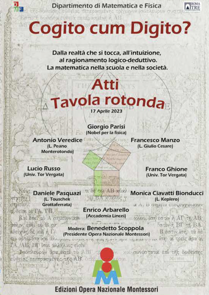 L’ONM con piacere rende disponibili gli Atti della Tavola Rotonda Cogito cum digito?, curata da Elisabetta Scoppola dell’Università di Roma Tre, tenutasi il 17 aprile 2023 con i seguenti interventi: Giorgio Parisi, Enrico Arbarello, Monica Ciavatti Bionducci, Franco Ghione, Francesco Manzo, Daniele Pasquazi, Lucio Russo, Antonio Veredice, moderatore Benedetto Scoppola.