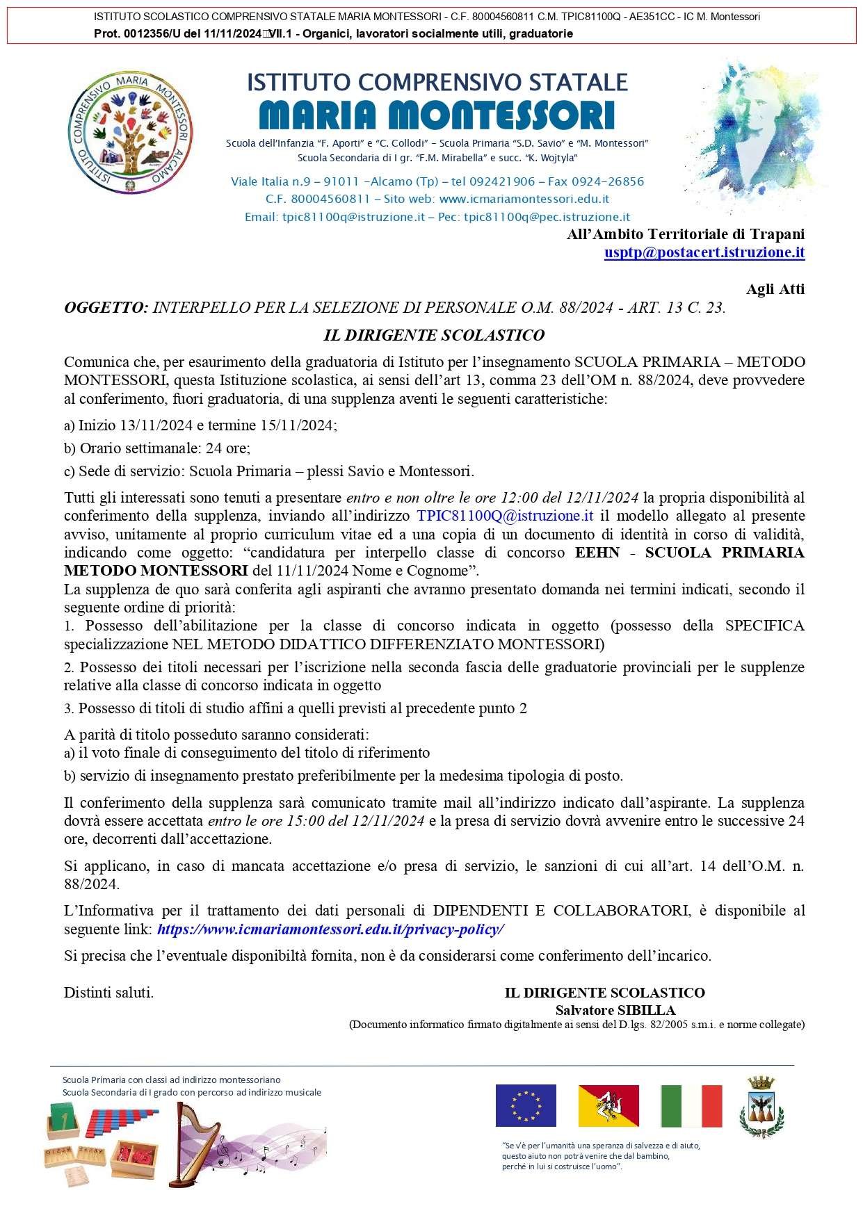 L’Istituto Comprensivo Statale Maria Montessori di Alcamo cerca un insegnante di scuola primaria per una supplenza di 24 ore settimanali. Chi fosse interessato può inviare la propria candidatura, una copia del documento di identità, il CV e il modello allegato …