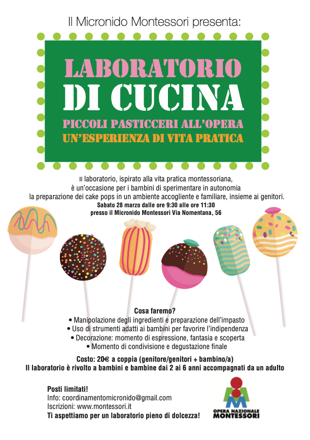 Il laboratorio, ispirato alla vita pratica montessoriana, è un’occasione per i bambini di sperimentare in autonomia la preparazione dei cake pops in un ambiente accogliente e familiare, insieme ai genitori.
