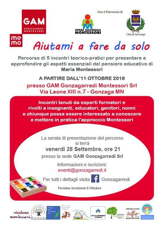 GAM Gonzagarredi Montessori Srl presenta un percorso 5 incontri teorico-pratici intitolati “Aiutami a fare da solo” per presentare e approfondire gli aspetti essenziali del pensiero educativo di Maria Montessori a partire dall’11 ottobre 2018.
