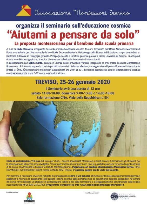 L’Associazione Montessori Treviso organizza il seminario “Aiutami a pensare da solo. La proposta montessoriana per il bambino della scuola primaria” che si terrà sabato 25 e domenica 26 gennaio 2020 presso la Sala formazione CNA in Viale della Repubblica, 154 a Treviso.