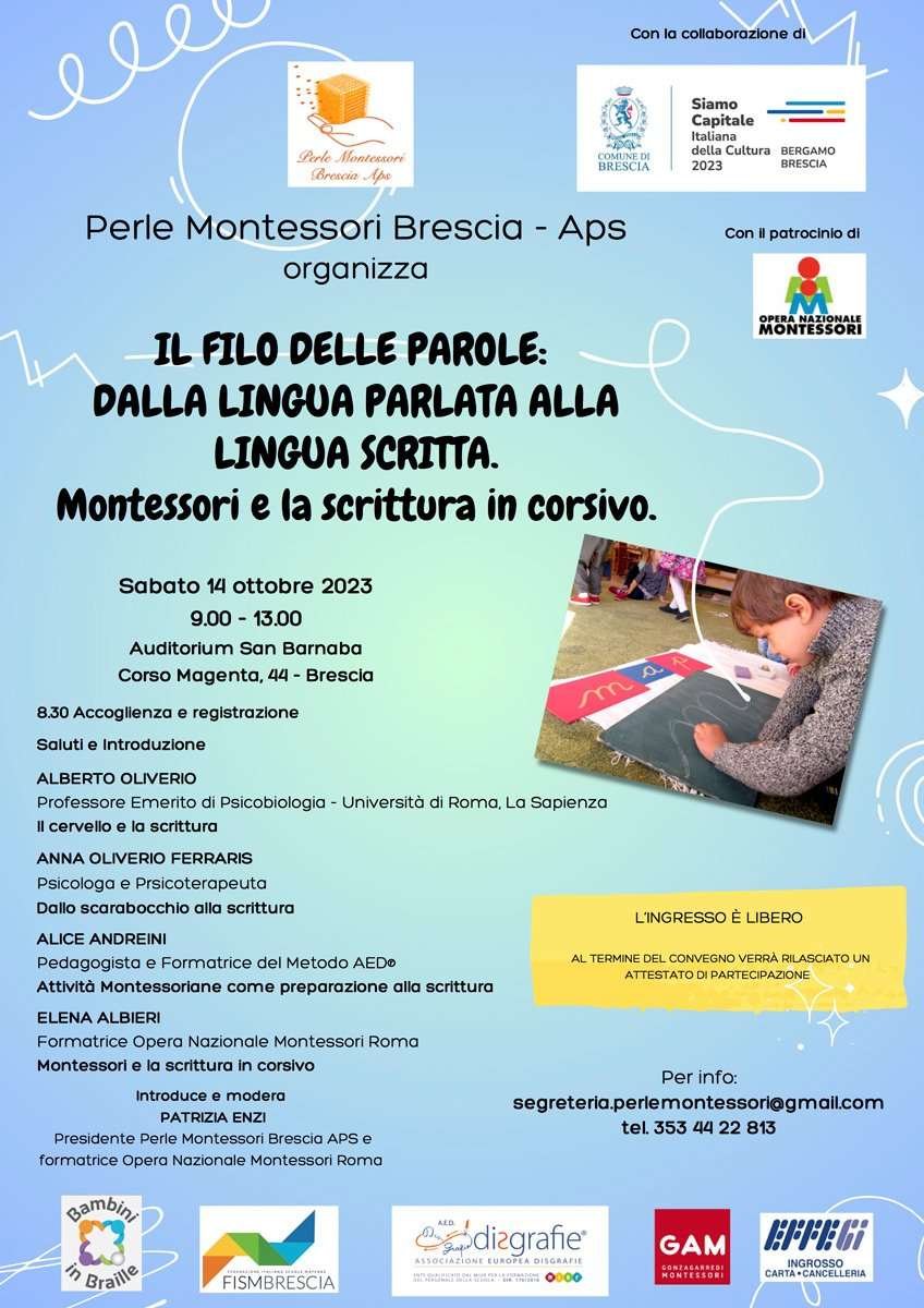 L’Associazione Perle Montessori Brescia, in collaborazione con il Comune di Brescia,  organizza per sabato 14 ottobre un convegno dal titolo “Il filo delle parole: dalla lingua parlata alla lingua scritta. Montessori e la scrittura”.