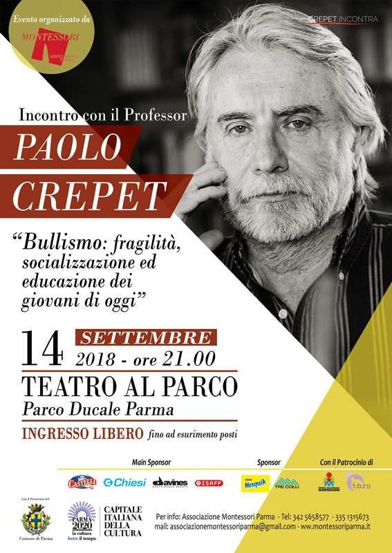 Venerdì 14 settembre alle ore 21,00 presso il Teatro al parco, nel Parco Ducale di Parma, si terrà un incontro con il Professor Paolo Crepet dal titolo: “Bullismo: fragilità, socializzazione ed educazione dei giovani di oggi”.