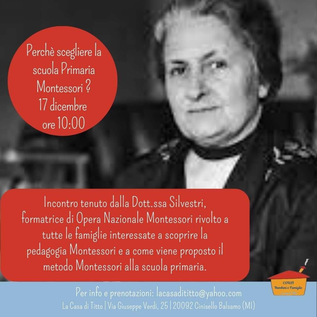 La Casa di Titto, scuola Montessori di Cinisello Balsamo (MI), organizza l’incontro dal titolo “Perché scegliere la scuola Primaria Montessori?” previsto per domenica 17 dicembre alle ore 10,00.