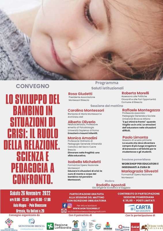 L’Associazione Montessori Brescia presenta per sabato 26 novembre il Convegno dal titolo “Lo sviluppo del bambino in situazioni di crisi: il ruolo della relazione. Scienza e pedagogia a confronto”.