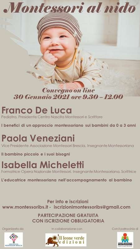 L’Associazione Montessori Brescia organizza un Convegno online dal titolo “Montessori al Nido” che si terrà sabato 30 gennaio 2021 dalle ore 9,30 alle ore 12,00.