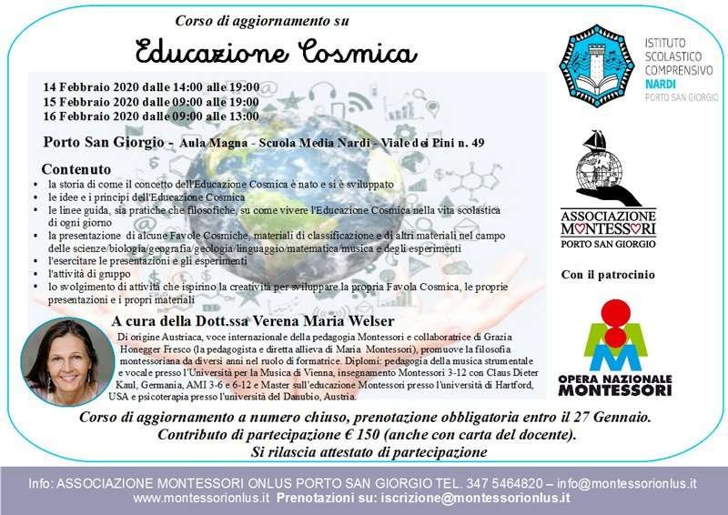 L’Associazione Montessori Onlus Porto San Giorgio organizza il corso di aggiornamento sull’Educazione Cosmica nelle giornate del 14, 15 e 16 febbraio presso l’Aula Magna della Scuola media Nardi in viale dei Pini, 49.
