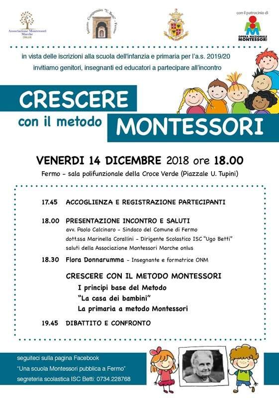 L’Associazione Marche ONLUS, in collaborazione con l’ISC “Ugo Betti” di Fermo, organizza, in vista delle iscrizioni alla scuola dell’infanzia e primaria, un incontro dal titolo “Crescere con il metodo Montessori” dedicato a genitori, educatori ed insegnanti.