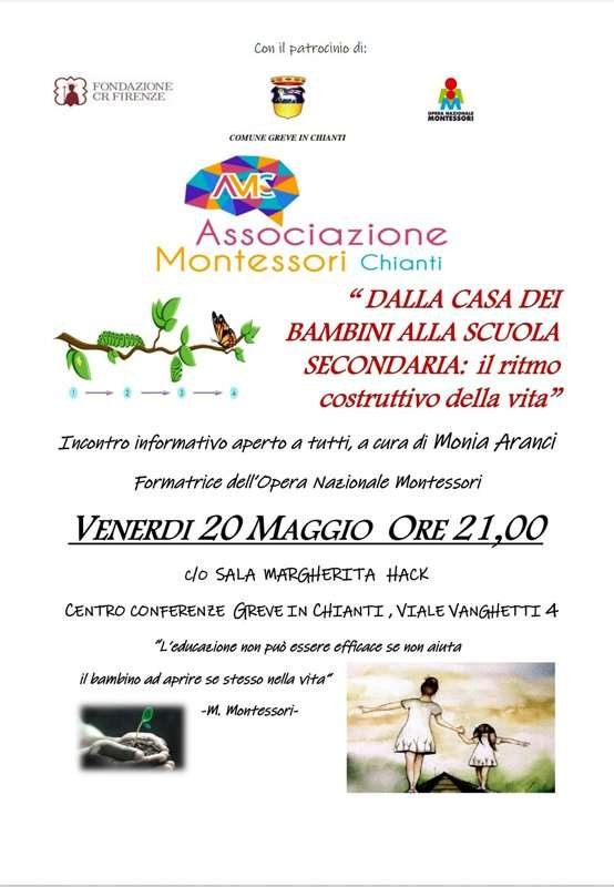 L’Associazione Montessori Chianti presenta l’incontro informativo “Dalla casa dei bambini alla scuola secondaria: il ritmo costruttivo della vita” che si terrà venerdì 20 maggio alle ore 21,00 presso la sala Margherita Hack nel Centro Conferenze Greve in Chianti in viale Vanghetti, 4.