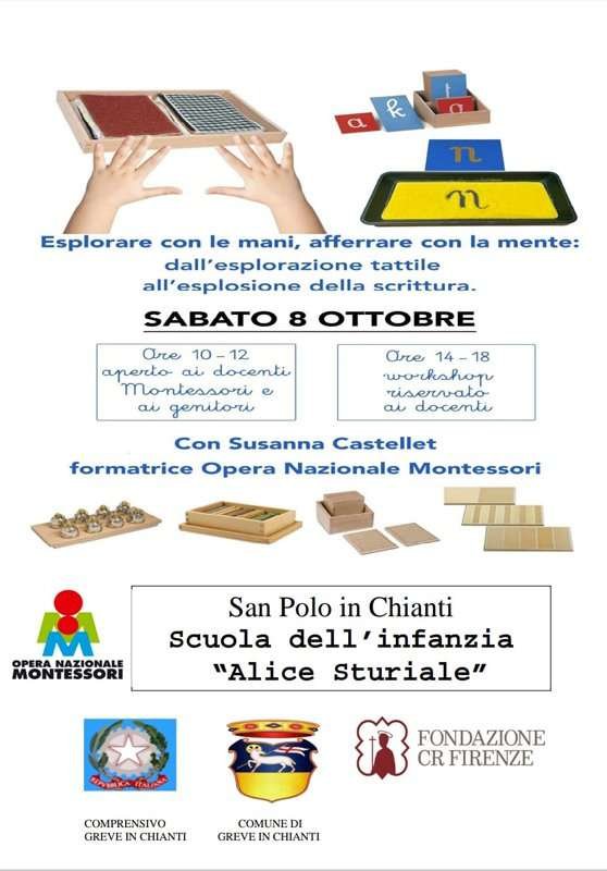 Presso la scuola dell’infanzia “Alice Sturiale” di San Polo in Chianti (FI) sabato 8 ottobre a partire dalle ore 10,00 si terrà l’incontro dal titolo “Esplorare con le mani, afferrare con la mente: dall’esplorazione tattile all’esplosione della scrittura” tenuto da Susanna Castellett, insegnante Montessori e formatrice dell’Opera Nazionale Montessori.