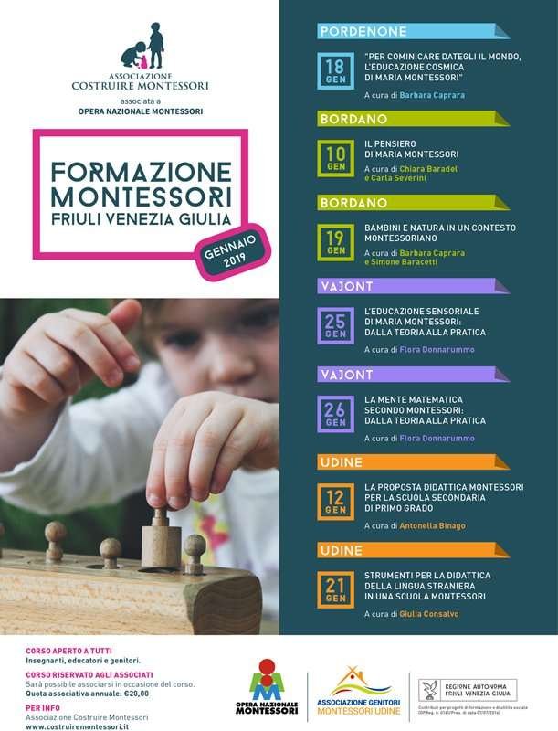 L’Associazione Costruire Montessori presenta una serie di iniziative per il mese di gennaio 2019 nelle città di Pordenone, Bordano, Vajont e Udine.