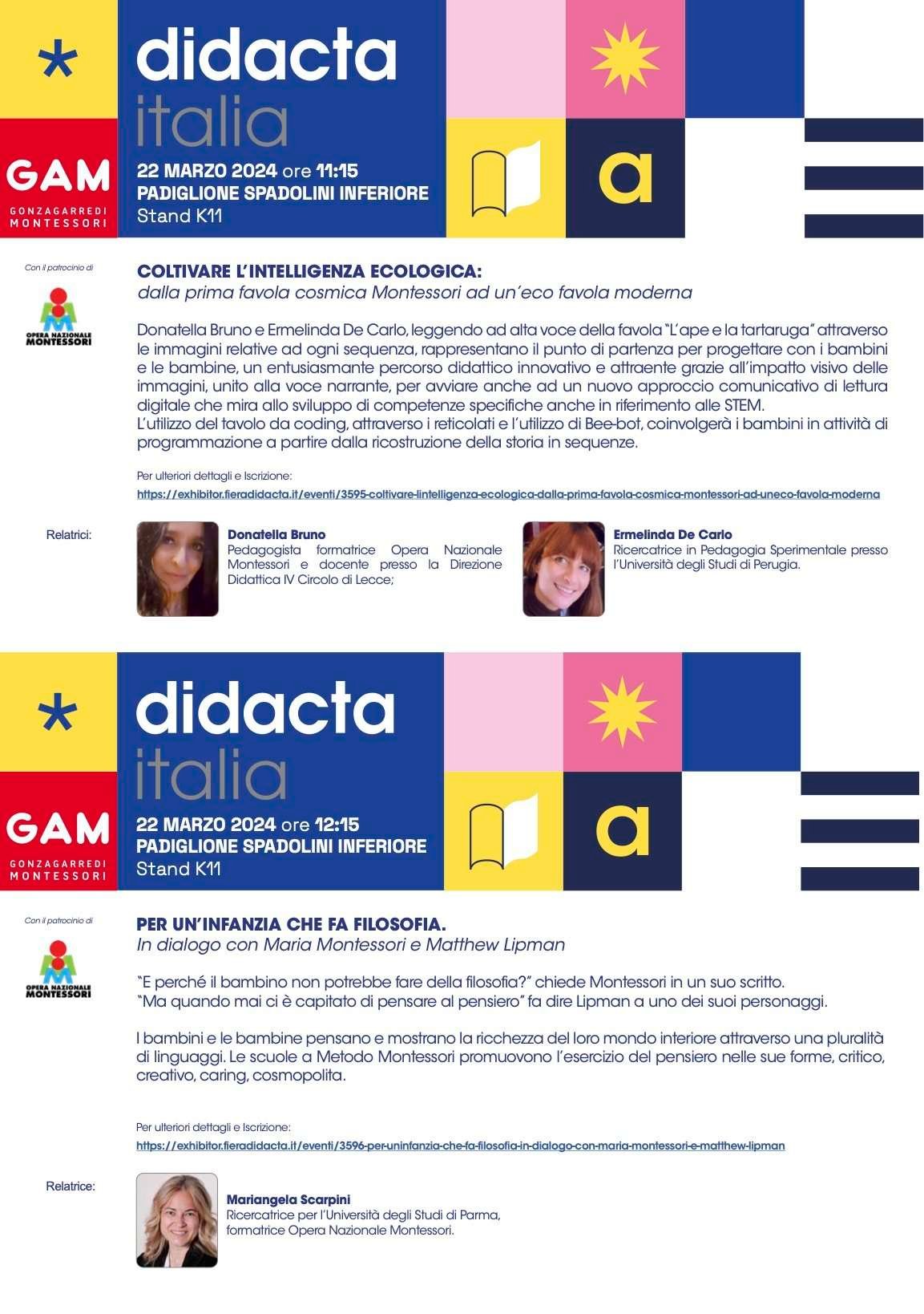 Venerdì 22 marzo 2024 nell’ambito della Fiera Didacta 2024 di Firenze allo stand K11 del padiglione Spadolini inferiore di Gonzagarredi si terranno due incontri montessoriani.
