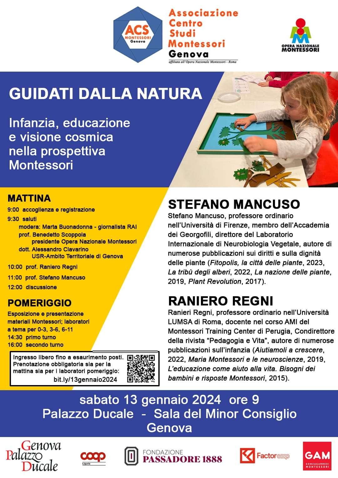 L’Associazione Centro Studi Montessori di Genova presenta per sabato 13 gennaio il Convegno “Guidati dalla natura. Infanzia, educazione e visione cosmica nella prospettiva Montessori” a partire dalle ore 9,00 presso la Sala del Minor Consiglio del Palazzo Ducale di Genova.