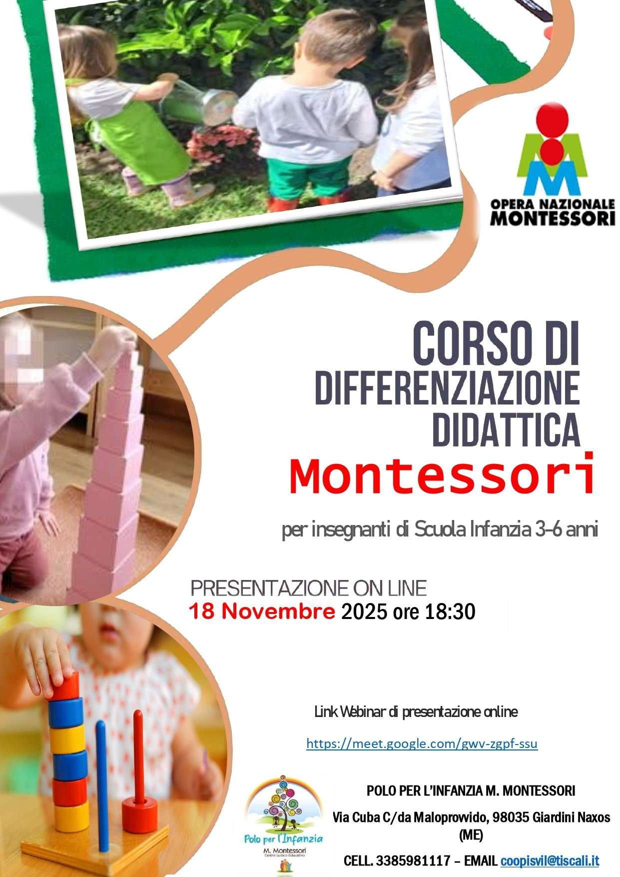Martedì 18 novembre, tramite la piattaforma Google Meet, si terrà un incontro online per presentare il Corso di differenziazione didattica Montessori per insegnanti di scuola dell’infanzia (3–6) che partirà a Giardini Naxos (ME) il 17 gennaio 2026.