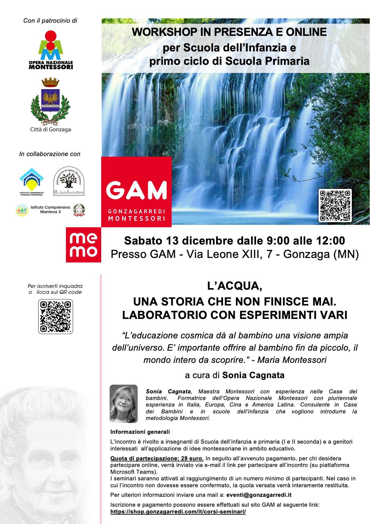La Gonzagarredi Montessori propone per sabato 13 dicembre un workshop con il tema “L’acqua, una storia che non finisce mai” dalle 9,00 alle 12,00 sia in modalità online che in presenza presso la sede GAM in via Leone XIII, 7 a Gonzaga (MN).