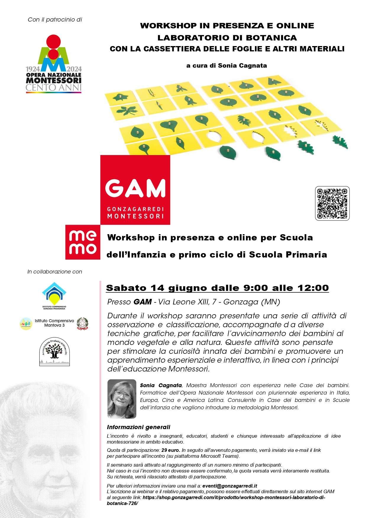 Sabato 14 giugno 2025, dalle ore 9:00 alle ore 12:00, presso la sede di GAM (GonzagArredi Montessori), sita in via Leone XIII, 7, Gonzaga (MN), si terrà il laboratorio di botanica a cura di Sonia Cagnata, educatrice e formatrice dell’ONM con pluriennale esperienza in Italia e all’Estero, nonché consulente nelle scuole e nei nidi Montessori.