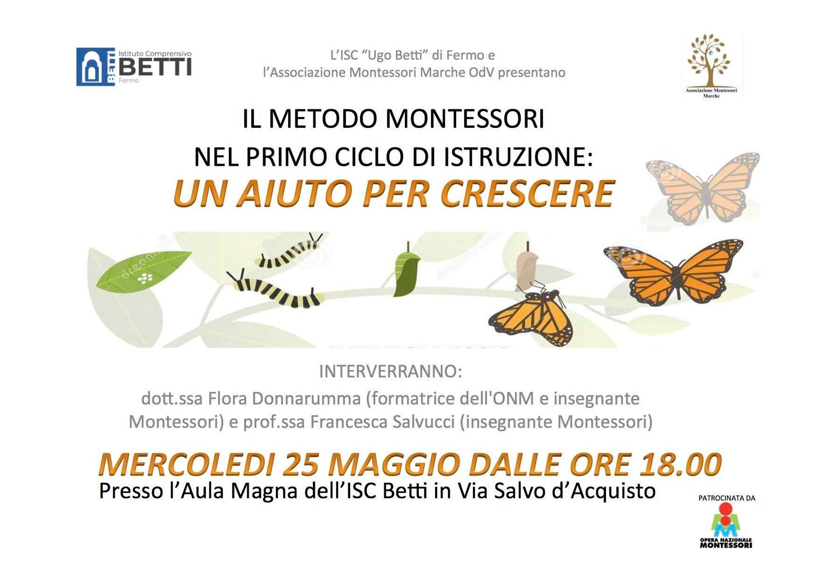 L’ISC Ugo Betti di Fermo e l’Associazione Montessori Marche OdV presentano l’incontro “Il metodo Montessori nel primo ciclo di Istruzione: un aiuto per crescere” alle ore 18,00 presso l’Aula Magnadell’ISC Betti in Via Salvo d’Acquisto. Interverranno Flora Donnarumma, insegnante e formatrice Montessori e Franesca Salvucci, insegnante Montessori.
