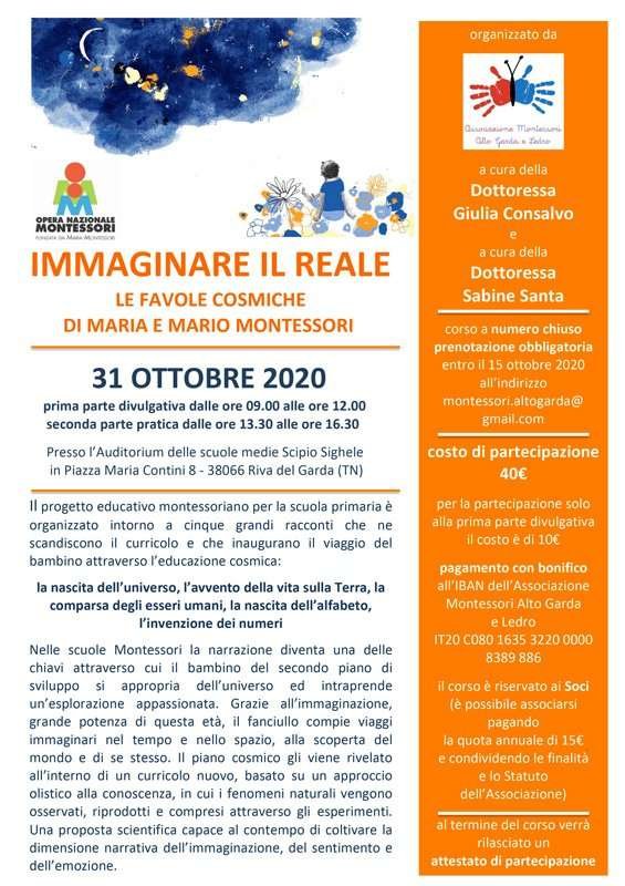 L’Associazione Montessori Alto Garda e Ledro organizza per sabato 31 ottobre il seminario “Immaginare il reale. Le favole cosmiche di Maria e Mario Montessori”. L’evento si terrà a Riva del Garda presso l’Auditorium delle scuole Scipio Sighele in Piazza Maria Contini, 8 e sarà suddiviso in una prima parte divulgativa dalle 9,00 alle 12,00 e una seconda parte pratica dalle 13,30 alle 16,30.