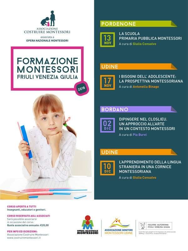 - 17 novembre, Udine: “I bisogni dell’adolescente. La prospettiva Montessoriana”, a cura di Antonella Binago;