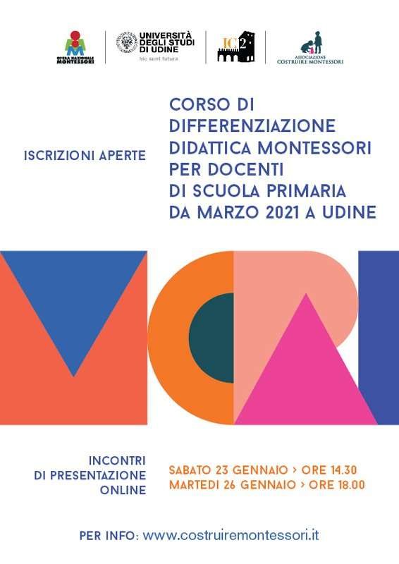 L’Associazione Costruire Montessori, ente gestore del corso, con il sostegno del II Istituto Comprensivo di Udine e con il patrocinio dell’Università degli Studi di Udine, organizza due incontri online per presentare il corso.