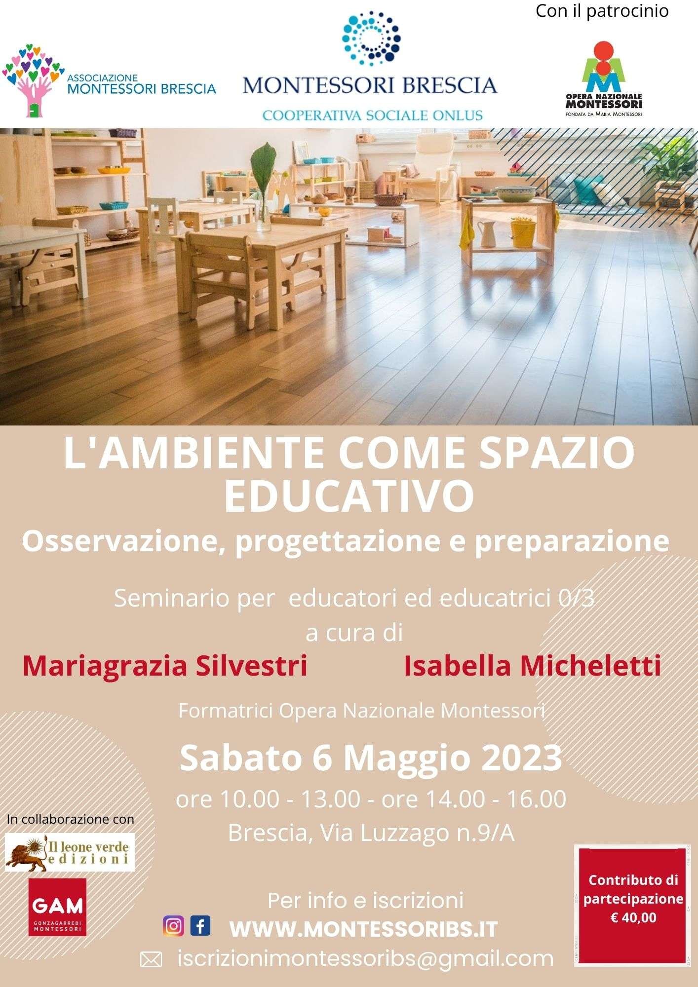 L’Associazione Montessori Brescia, in collaborazione con Il leone verde Edizioni e la Gonzagarredi Montessori, organizza per sabato 6 maggio un seminario dal titolo “L’ambiente come spazio educativo. Osservazione, progettazione e preparazione”.