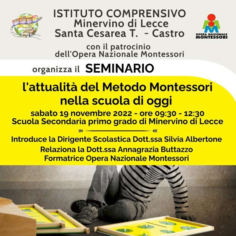 L’Istituto Comprensivo Minervino di Lecce, Santa Cesarea Terme e Castro organizza il seminario “L’attualità del metodo Montessori nella scuola di oggi” per sabato 19 novembre dalle ore 9,30 alle ore 12,30 presso la Scuola secondaria di primo grado di Minervino di Lecce.