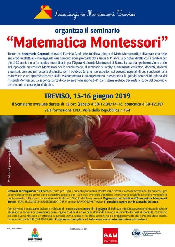 L’Associazione Montessori Treviso organizza il seminario di formazione dedicato alla Matematica Montessori nelle giornate di sabato 15 dalle ore 8,30 alle 18,00 con pausa pranzo e domenica 16 giugno dalle ore 8,30 alle 12,30 presso la Sala formazione CNA in viale della Repubblica, 154.