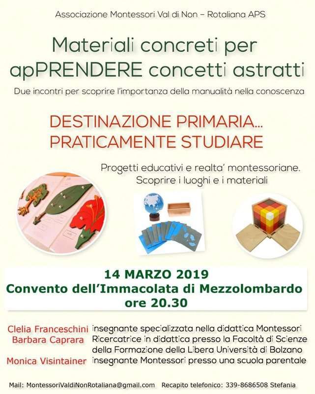 “Materiali concreti per apprendere concetti astratti” è il titolo dell’incontro dedicato alla scoperta dei progetti educativi e delle realtà montessoriane conoscendo luoghi e materiali che si terrà giovedì 14 marzo presso il Convento dell’Immacolata di Mezzolombardo alle ore 20,30.