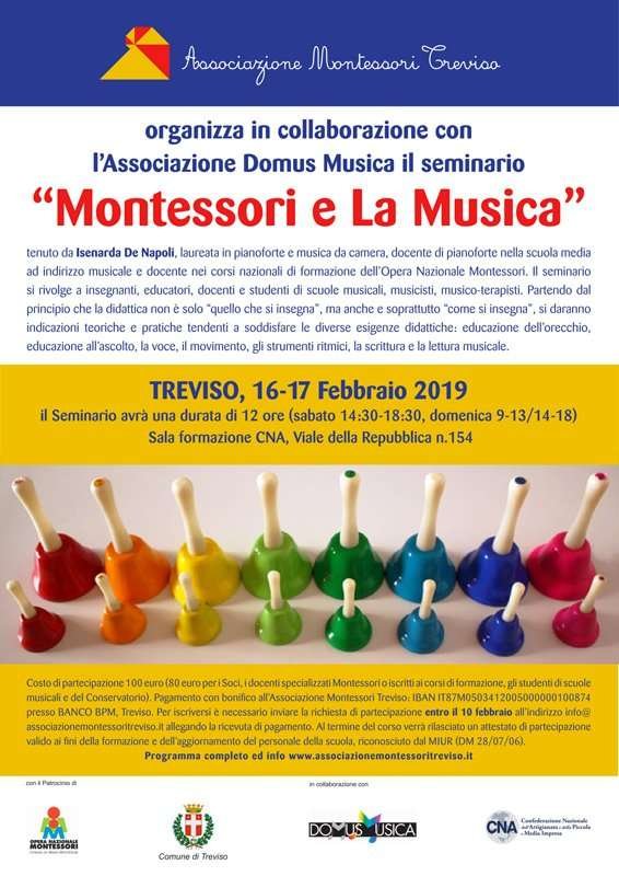 L’Associazione Montessori Treviso organizza in collaborazione con l’Associazione Domus Musica il seminario “Montessori e la musica” che si terrà nelle giornate di sabato 16 e domenica 17 febbraio presso la Sala formazione CNA in viale della Repubblica, 154.
