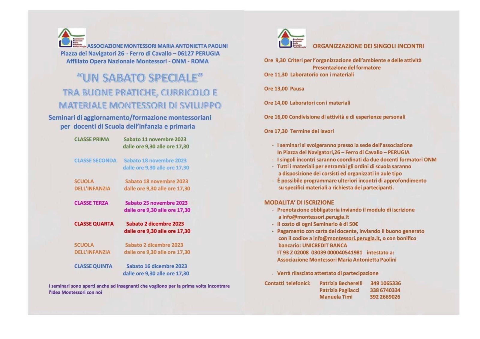 la prenotazione è obbligatoria inviando il modulo di iscrizione che trovate in allegatocompilato all’indirizzo info@montessori.perugia.it; il costo di ogni seminario è di 50,00 euro; sarà possibile effettura il pagamento con la carta del docente (invio del buono al medesimo indirizzo email) o bonifico bancario (IT 93 Z 02008 03039 000040541981 intestato ad: Associazione Montessori Maria Antonietta Paolini).