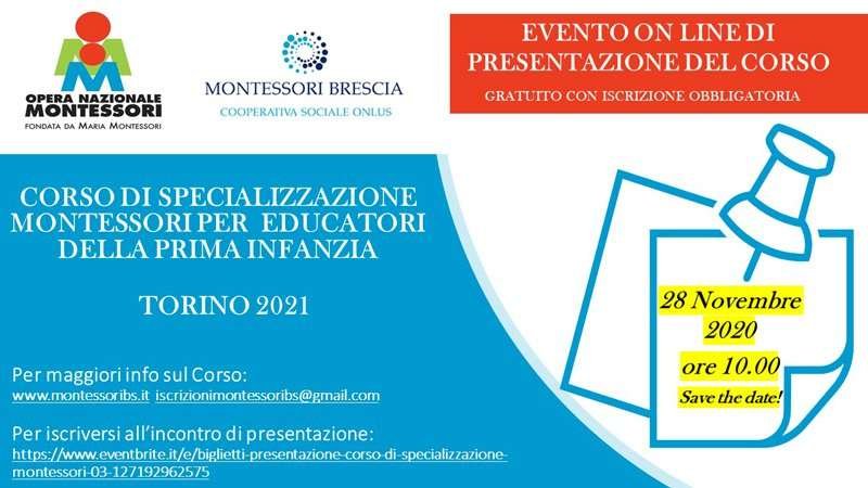 La Montessori Brescia Cooperativa Sociale Onlus organizza per sabato 28 novembre alle ore 10,00 un incontro online di presentazione del corso di specializzazione Montessori per educatori della prima infanzia che partirà il 5 marzo 2021 a Torino.