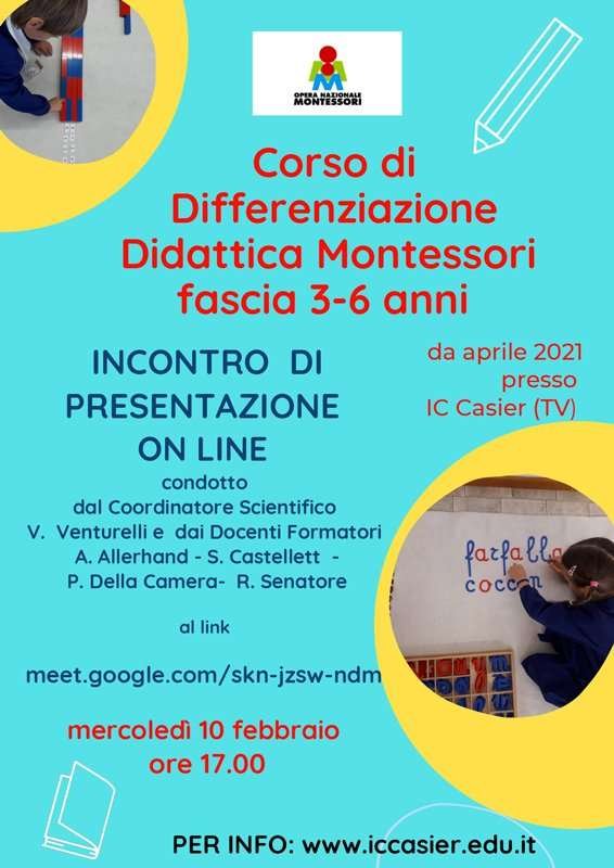 Mercoledì 10 febbraio 2021 alle ore 17,00 si terrà la presentazione online del Corso di differenziazione didattica Montessori per insegnanti di scuola dell’infanzia che partirà ad aprile a Casier (TV).