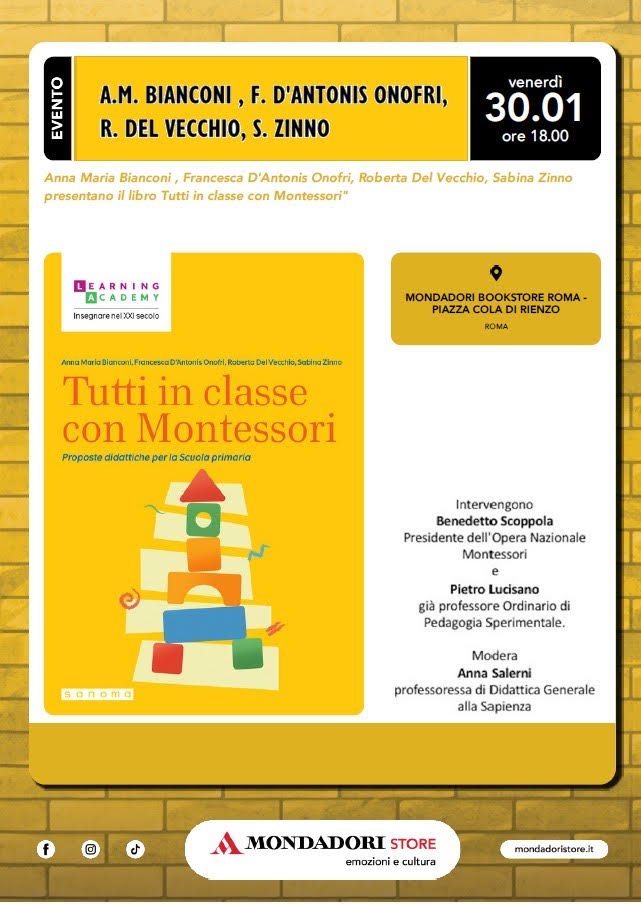 Venerdì 30 gennaio alle ore 18,00 presso il Mondadori Bookstore a piazza Cola di Rienzo di Roma si terrà la presentazione del libro “Tutti in classe con Montessori” con gli autori Anna Maria Bianconi, Francesca D’Antonis Onofri, Roberta Del Vecchio e Sabina Zinno.