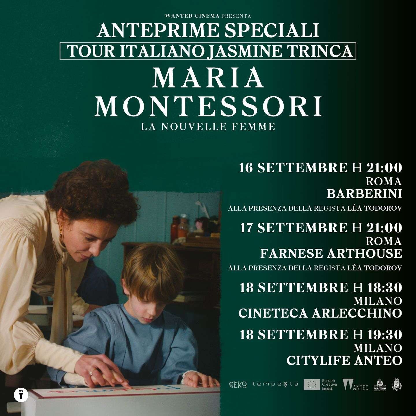 Il film verrà proiettato a Roma lunedì 16 settembre al cinema Barberini e martedì 17 settembre al cinema Farnese alle ore 21,00 con la partecipazione dell’attrice Jasmine Trinca, interprete di Maria Montessori, e la regista Léa Todorov.