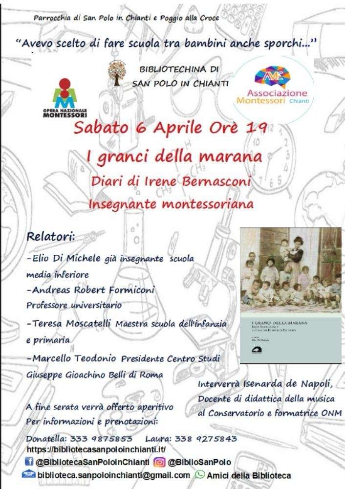 L’Associazione Montessori Chianti sabato 6 aprile 2024 alle ore 19.00 organizza presso la Bibliotechina di San Polo in Chianti (FI) l’incontro “I granci della marana. Diari di Irene Bernasconi, insegnante montessoriana”.
