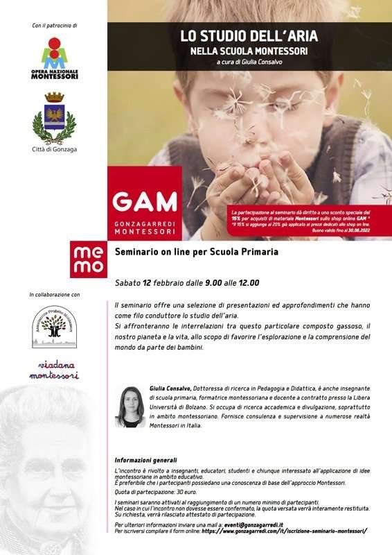 La partecipazione ad ogni seminario dà diritto ad uno sconto del 15% per acquisti di materiale Montessori sullo shop online GAM