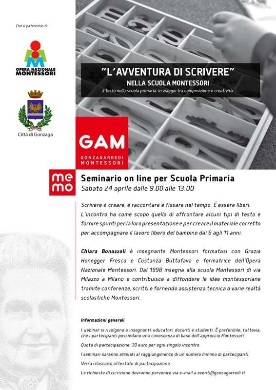 - Sabato 24 aprile si terrà l’incontro dal titolo “L’avventura di scrivere nella scuola Montessori. Il testo nella Scuola primaria: il viaggio tra composizione e creatività” che sarà tenuto da Chiara Bonazzoli, insegnante Montessori;