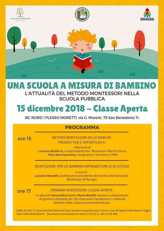 L’Associazione Montessori Marche Onlus presenta l’incontro dal titolo “Una scuola a misura di bambino. L’attualità del metodo Montessori nella scuola pubblica” che si terrà a partire delle ore 15,00 sabato 15 dicembre presso l’ISC Nord (plesso Moretti) in via G. Moretti, 79.