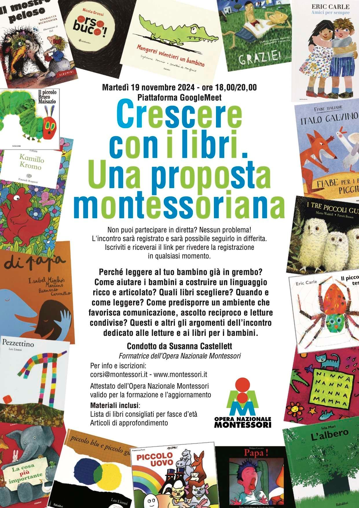 L’Opera Nazionale Montessori – ETS propone un webinar dal titolo “Crescere con i libri: una proposta montessoriana da 0 a 3 anni” previsto online per martedì 19 novembre dalle 18,00 alle 20,00.