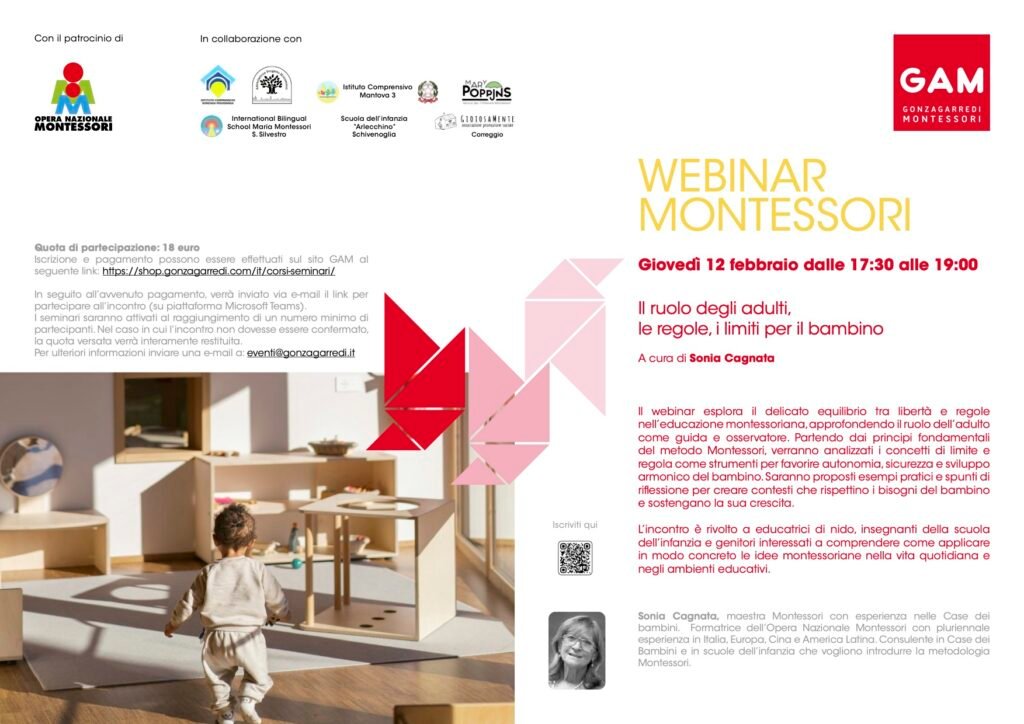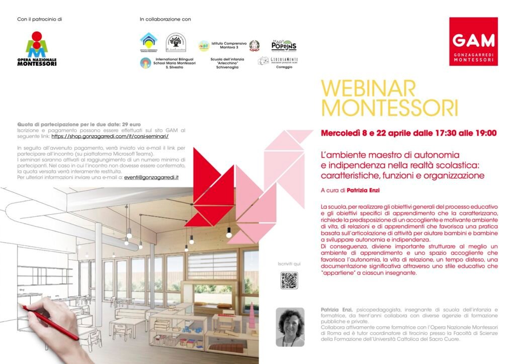 Gonzaga Arredi Montessori (GAM) organizza un ciclo di incontri online tenuti da: Sognia Cagnata, educatrice e formatrice dell’ONM; Giulia Consalvo, insegnante e formatrice dell’ONM; Barbara Caprara, Professoressa di Didattica e Pedagogia speciale presso l’Università di Modena e Reggio Emilia e Patrizia Enzi, insegnante e formatrice dell’ONM.