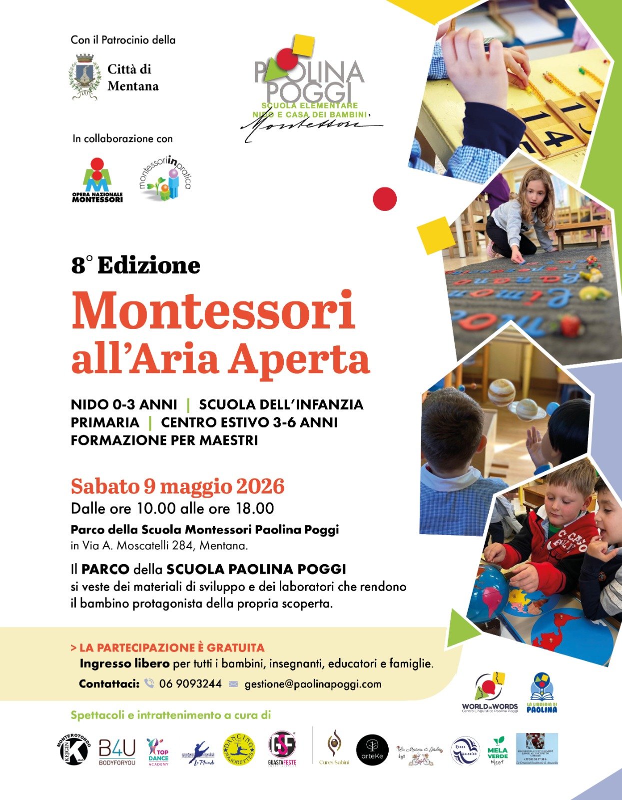 L’iniziativa, patrocinata dal Comune di Mentana, in collaborazione con l’Opera Nazionale Montessori e Montessoriinpratica, prevede, per tutto il giorno, numerose attività educative: dalla “vita pratica” al “sensoriale”, troverete i materiali dedicati all’apprendimento del linguaggio e della matematica a quelli scientifici e della lingua inglese; le attività saranno organizzate per età dai 0 ai 12 anni.