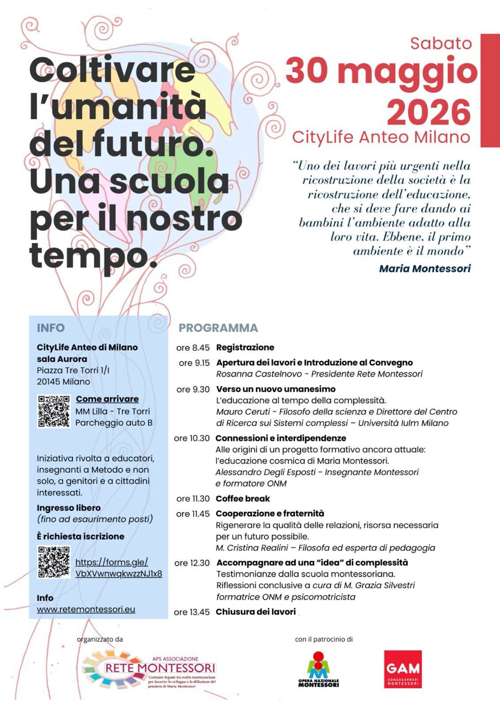 Introdurrà il Convegno Rosanna Castelnovo, Presidente della Rete Montessori; interverranno: Mauro Ceruti, Filosofo della scienza e Direttore del Centro di Ricerca sui Sistemi complessi dell’Università Iulm di Milano; Alessandro Degli Esposti, insegnante Montessori e formatore dell’ONM; Maria Cristina Realini, filosofa ed esperta di pedagogia; Maria Grazia Silvestri, formatrice dell’ONM e Psicomotricista.
