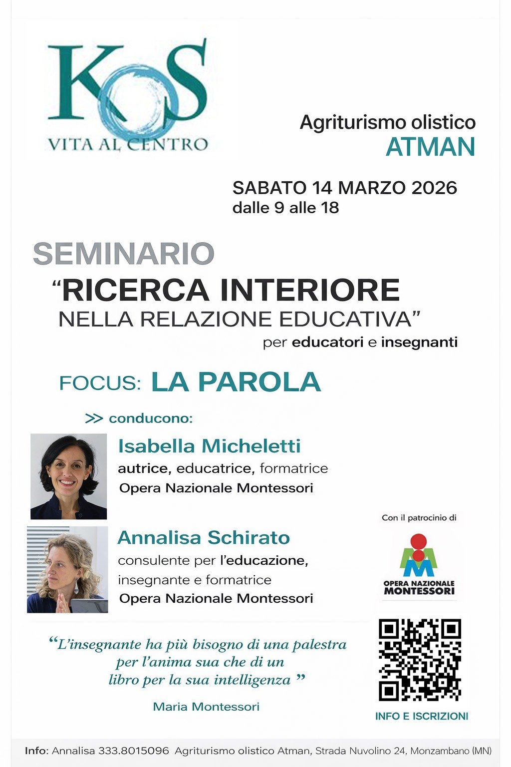 Il seminario è dedicato a genitori e insegnanti ed è condotto da Isabella Micheletti, autrice, educatrice e formatrice dell’ONM, e Annalisa Schirato, consulente per l’educazione, insegnante e formatrice ONM.