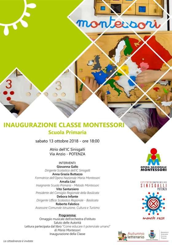 Sabato 13 ottobre alle 18,00, presso l’Istituto Comprensivo Sinisgalli di Potenza in via Anzio, si terrà l’inaugurazione di una classe Montessori della scuola primaria. Interverranno all’evento: Giovanna Gallo, Dirigente dell’IC Sinisgalli; Anna Grazia Buttazzo, formatrice dell’Opera Nazionale Montessori; Amalia Lioi, insegnante …