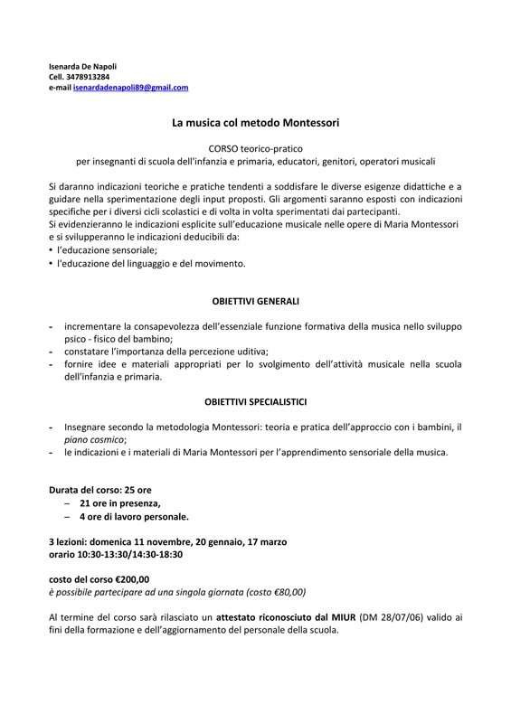 L’Associazione MaMu Cultura Musicale, con il patrocinio dell’Opera Nazionale Montessori, propone due corsi di formazione articolati in 3 giornate condotto dalla docente Isenarda De Napoli su “La Musica con il Metodo Montessori”. I corsi teorico-pratici si rivolgono a:- docenti di scuola dell’infanzia e …