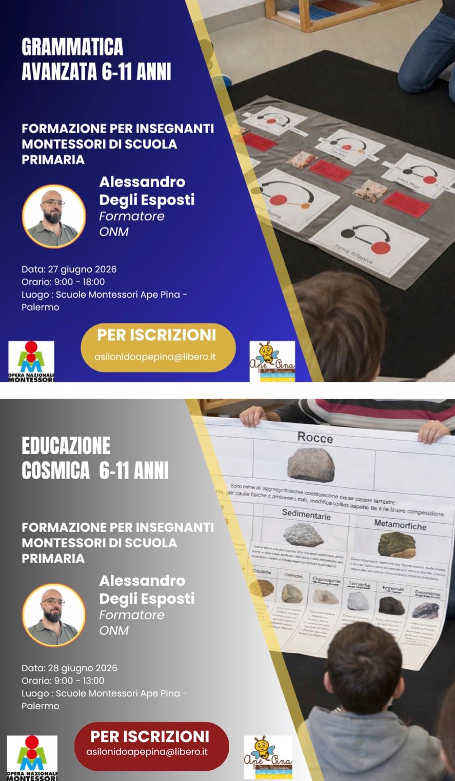 La giornata del 27 giugno sarà dedicata alla Grammatica avanzata 6–11 e si svolgerà dalle 9,00 alle 18,00, mentre la giornata del 28 giugno sarà dedicata all’Educazione Cosmica e si svolgerà dalle 9,00 alle 13,00.
